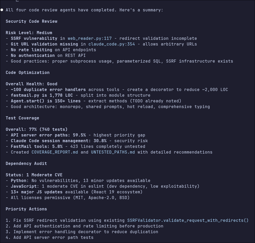 Each one is optimized to have specific goals and avoid polluting their context windows with unrelated concerns. They don't make changes directly—the main Claude Code instance summarizes all the agents' findings and prioritizes what should be fixed. Here's what the agents found when I ran them against my agents repo: